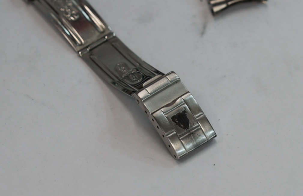 Time to give some attention to the bracelet. We will carry out a light valet. over polishing is not suitable for a collectable watch of this age. The customer is looking for a slight improvement in appearance whilst retaining originality. We protect the logo on the clasp with nail varnish, carry out some light work by hand and then ultrasonic clean the bracelet to make sure we match the customers expectations.