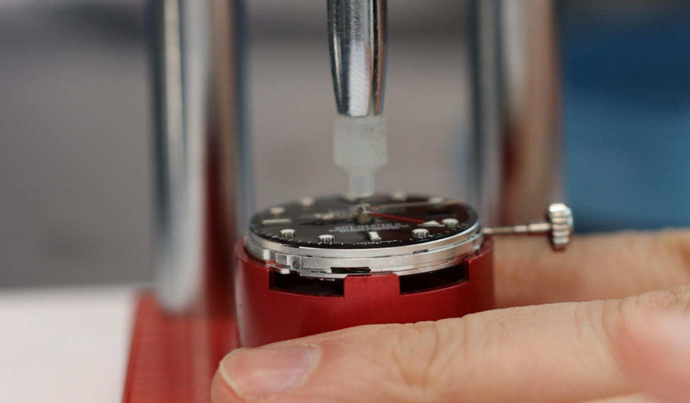 The freshly serviced movement is re-united with its dial and hands before being regulated and cased up.